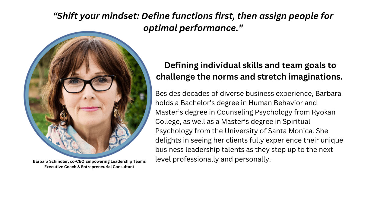 You may have questions about creating your functional organizational chart. Please don’t hesitate to contact me, Barbara Schindler.